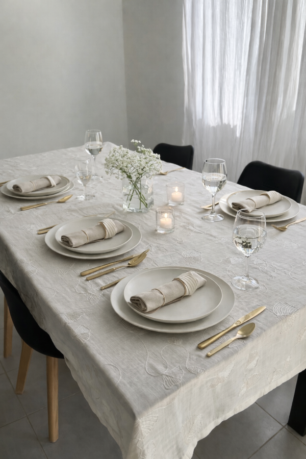 Mantel confeccionado en lino bordado, aporta elegancia a tu mesa